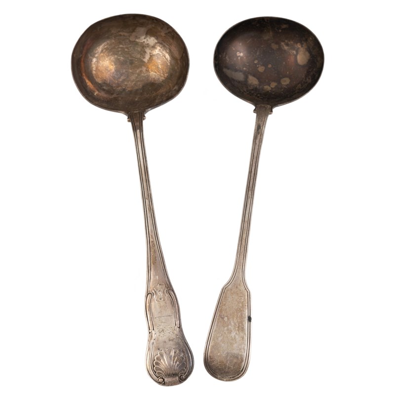 the terminal crested, plus a William IV silver Fiddle and Thread pattern soup ladle, by William Chawner, London 1830, approx. total weight 15.5oz. (2)