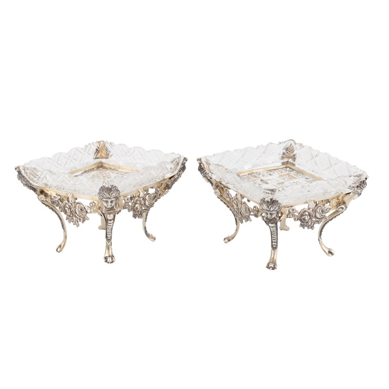 triangular form, pierced and cast with rose garlands, on four mask capped beaded scroll legs, with two similar cut glass dishes, length 12.4cm, approx. weight 6oz. (2)