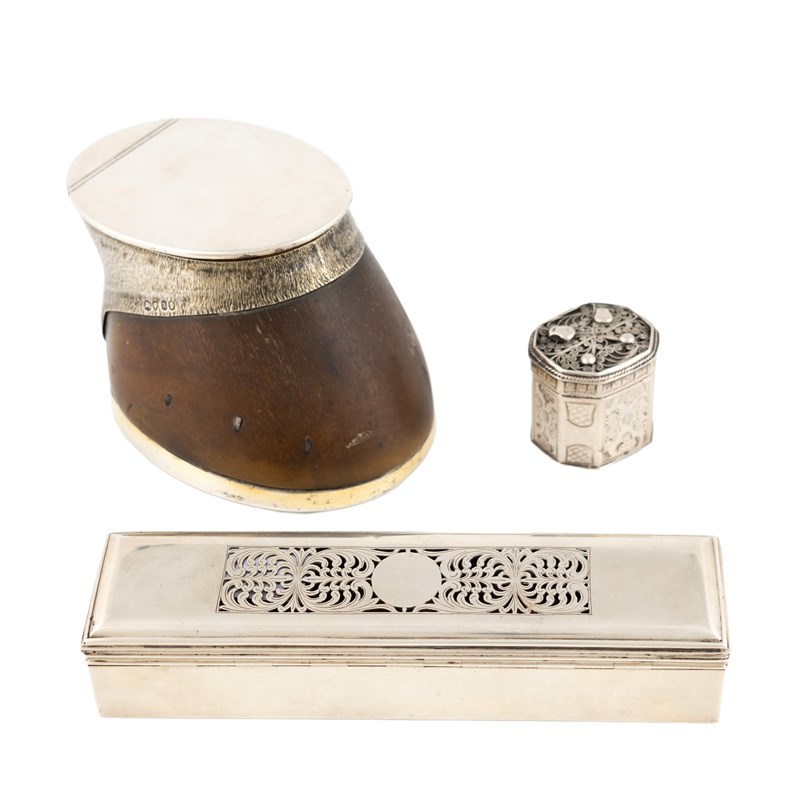 the mounts with textured hair on a horseshoe base, plus a 19th-century Dutch silver box and a George IV silver box by William Parker, London 1820, length 16.7cm, total approx. weighable 8.1oz. (3)
