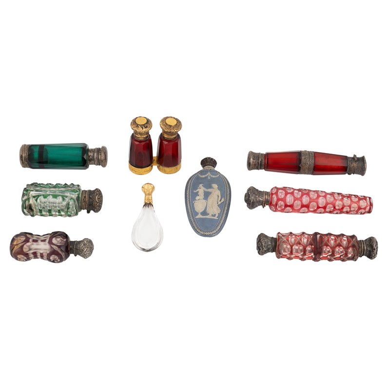 comprising: three flashed with ruby, amethyst and green, one Jasperware, a double side by side scent bottle, plus various others. (9)