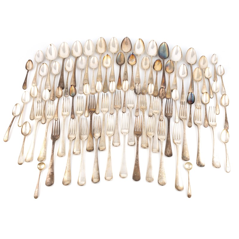 comprising: twenty-four table forks by William Sumner, London 1794, twelve tablespoons, fifteen dessert spoons, twenty-four teaspoons and a pair of salt spoons, total approx. weight 110.8oz. (77)