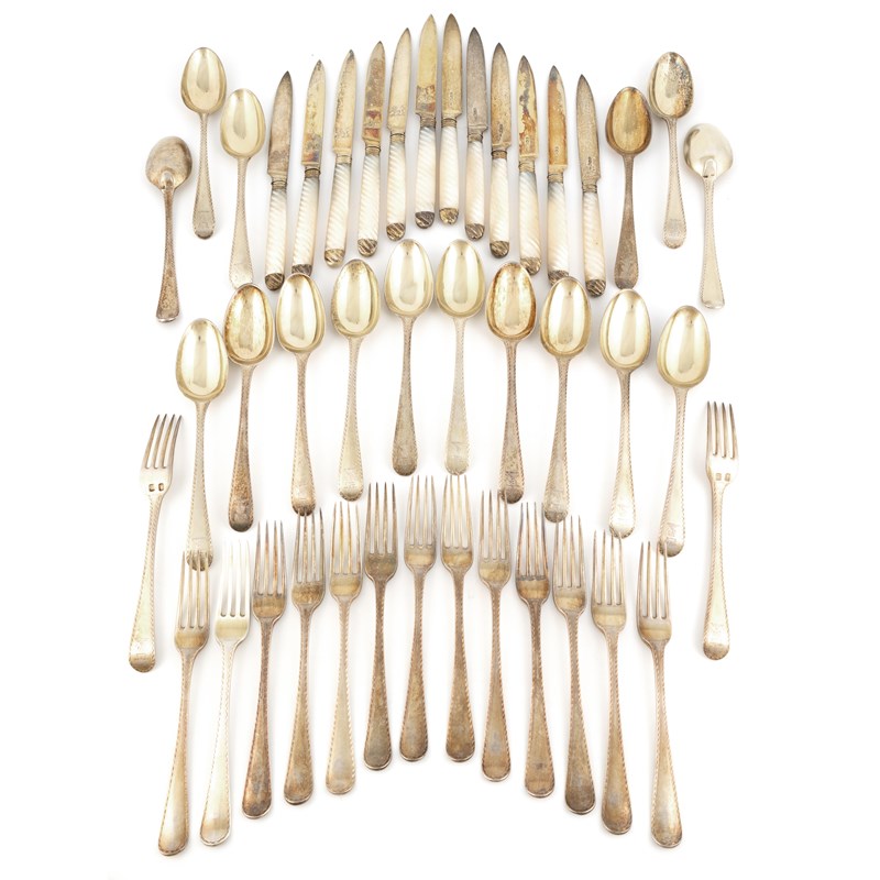 comprising: sixteen dessert spoons and fifteen dessert forks, all with engraved crowned crests, plus a set of twelve mother-of-pearl handled silver-gilt dessert knives by Moses Brent, London 1802, total approx. weighable 42oz. (43)