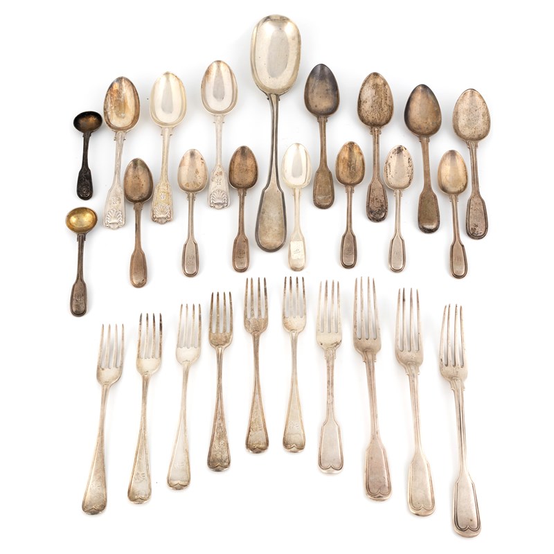 comprising: a serving spoon by Eley, Fearn & Chawner, London 1808, three table forks, seven dessert forks, four tablespoons, seven dessert spoons, a pair of salt spoons, three Shell, Fiddle and Thread pattern dessert spoons by George Adams, London 1876, total approx. weight 40.8oz. (27)