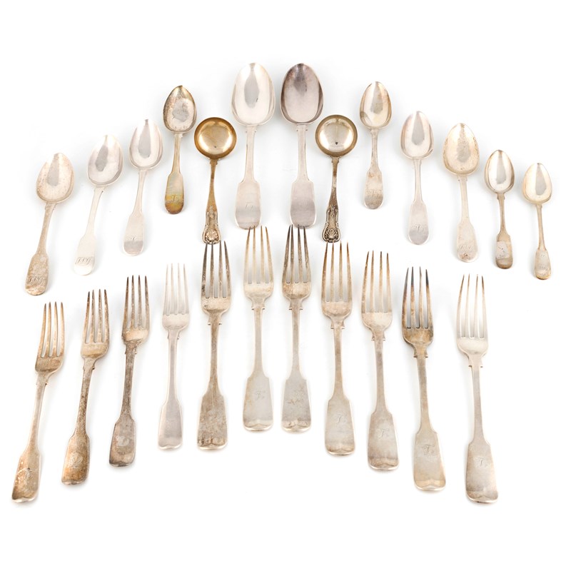 comprising: seven Victorian table forks by William Jamieson, Edinburgh 1837, four dessert forks, a pair of tablespoons, seven dessert spoons, a pair of teaspoons and a pair of sauce ladles, total approx. weight 36.5oz. (24)