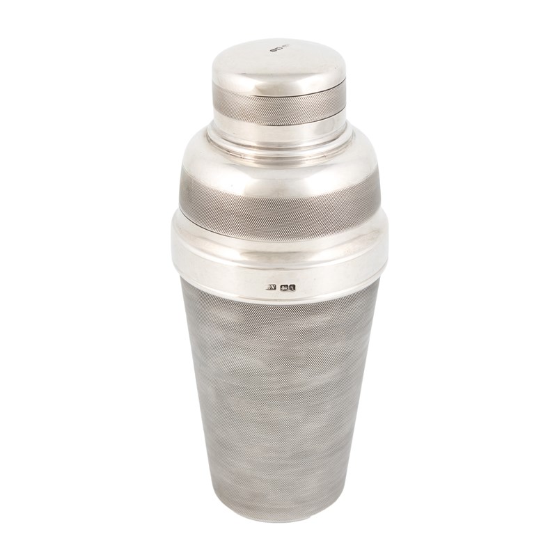 tapering circular form with engine-turned decoration, pull-off covers, height 20.5cm, approx. weight 15.4oz.