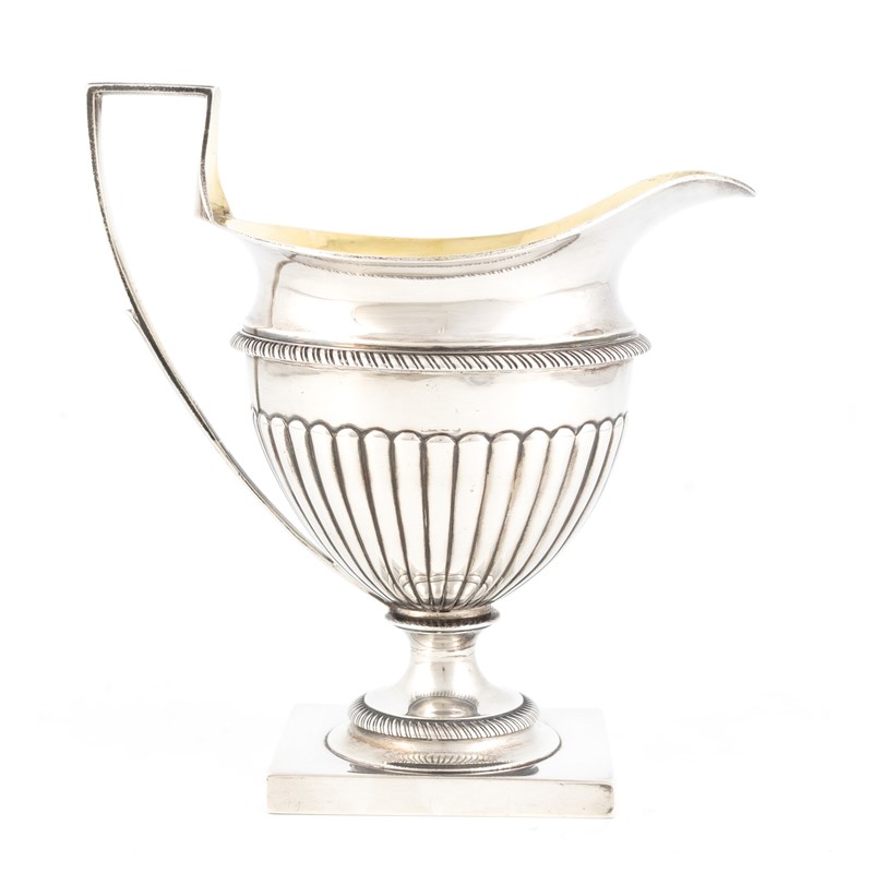 baluster form with part-fluted decoration and a gadrooned girdle, on a circular foot on top of a rectangular base, height 16cm, approx. weight 10.3oz.