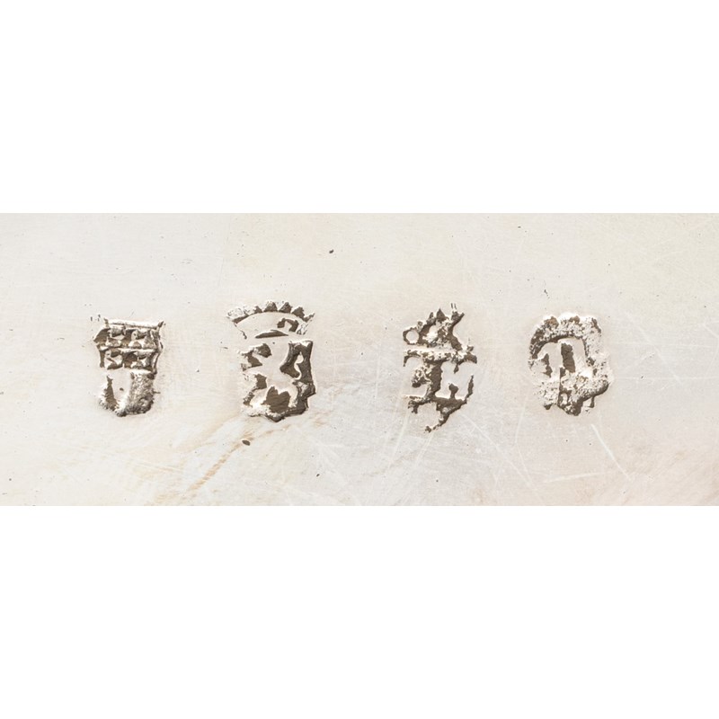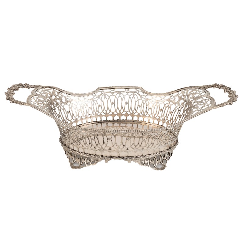 oval form with a beaded border, pierced scroll foliate decoration, on four pierced bracket feet, length 47.6cm, approx. weight 39.8oz.