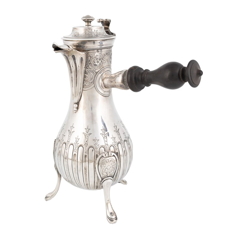 baluster form, with part-fluted and foliate decoration, turned wooden side handle, on three scroll legs, height 26.1cm, approx. weight 24.6oz.