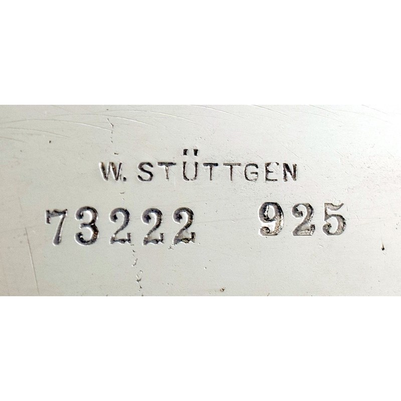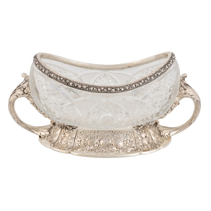 oval form with embossed scroll and foliate decoration, two scroll handles with acanthus leaf decoration with swags of foliate decoration, the cut glass bowl with a silver-mounted foliate border, length 41.3cm, approx. weighable 30.1oz.