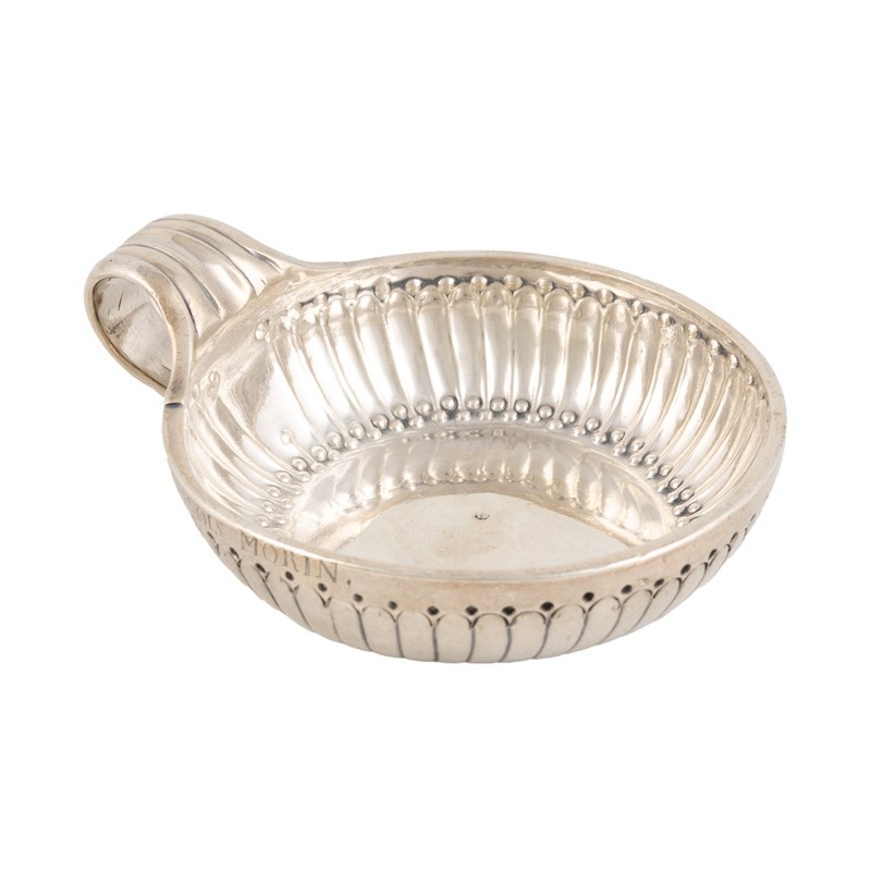 circular form, fluted decoration, fluted ring handle, length 10.5cm, approx. weight 3.7oz.