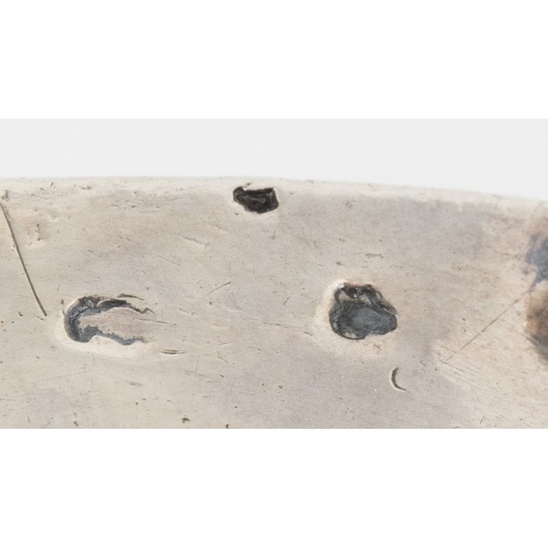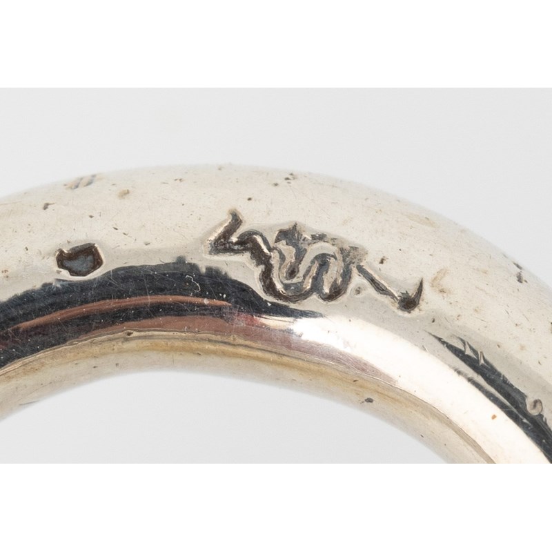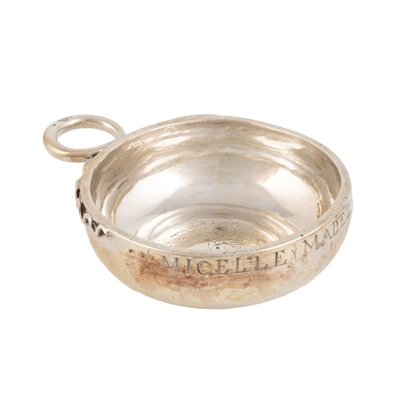 circular form, snake ring handle, inscribed 'Micelle Madez', the centre engraved with a Bacchanalian cherub astride a barrel, length 11.3cm, approx. weight 3.4oz.