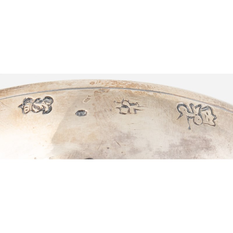 circular form, the shaped scroll thumb-piece engraved with a cherub holding a bunch of grapes, also inscribed 'Aux Divins Amis', with a finger ring, length 11.2cm, approx. weight 4.3oz.