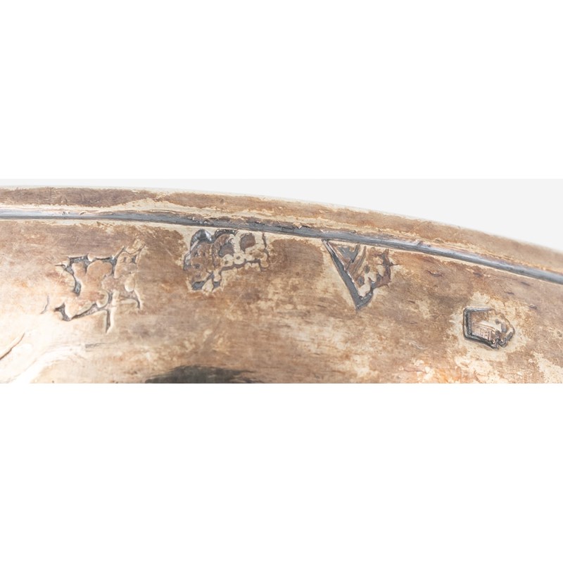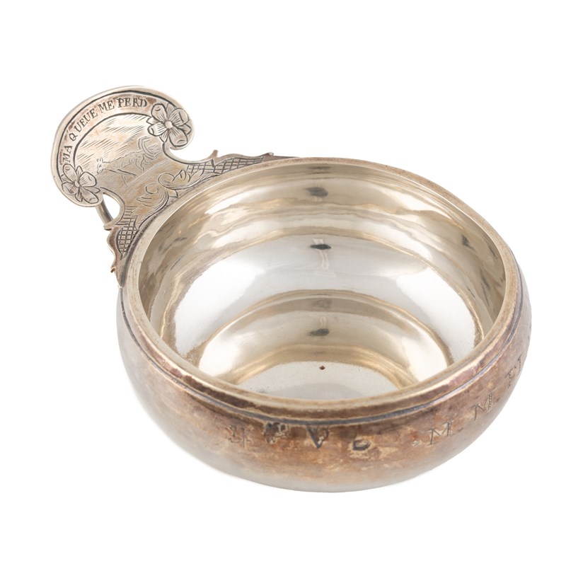 circular form, the shaped scroll thumb-piece engraved with a fox in a trap, also inscribed 'Ma Queue Me Perd', with a finger ring, the side inscribed 'M.M. Flanbabd', length 11.2cm, approx. weight 3.6oz.