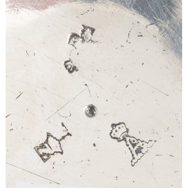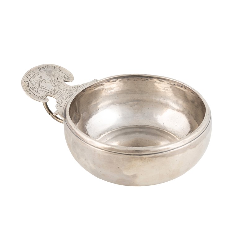 circular form, the shaped scroll thumb-piece engraved with a lady drinking wine and a cherub playing an instrument, also inscribed 'IE Las Fais Danger', with a finger ring, length 12cm, approx. weight 3.4oz.