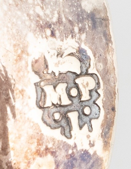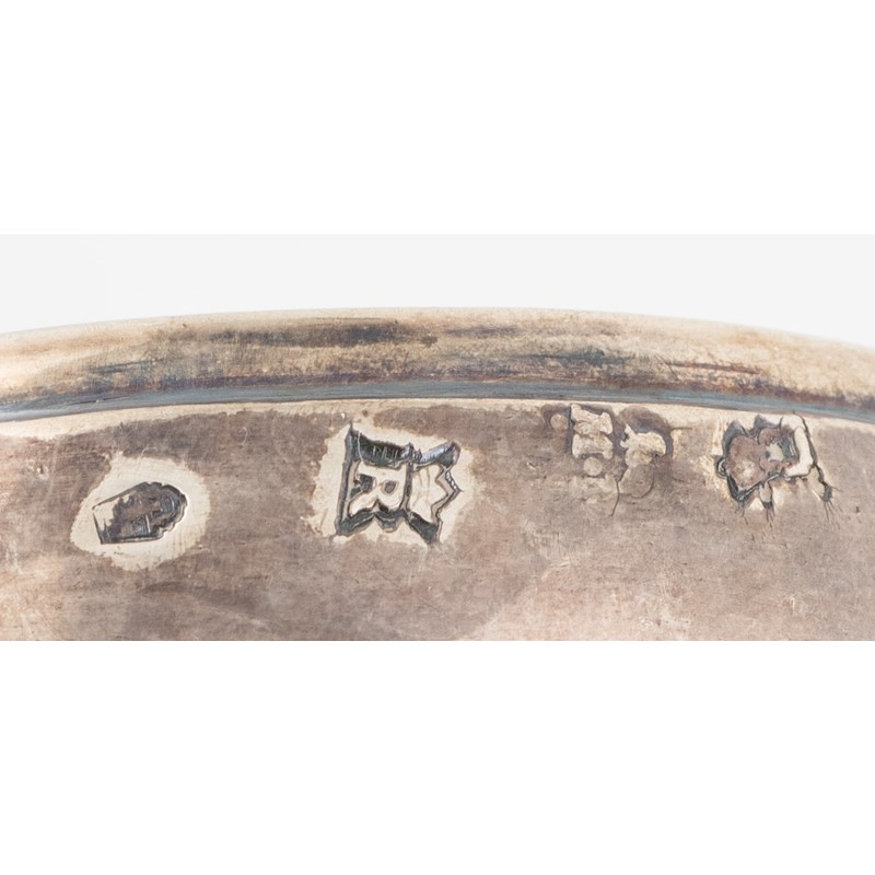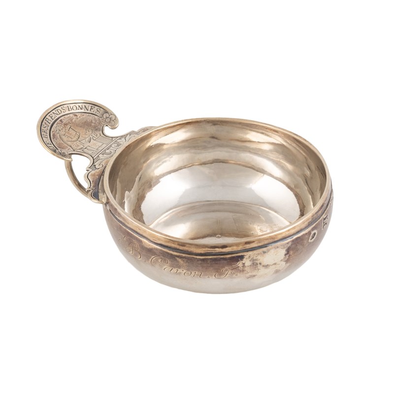 circular form, the shaped scroll thumb-piece engraved with a man holding a hammer over a laying woman, her head on a support, also inscribed 'Je Les Rends Bonnes', with a finger ring, the side inscribed 'B. Caron Fs', length 11.2cm, approx. weight 3.4oz.