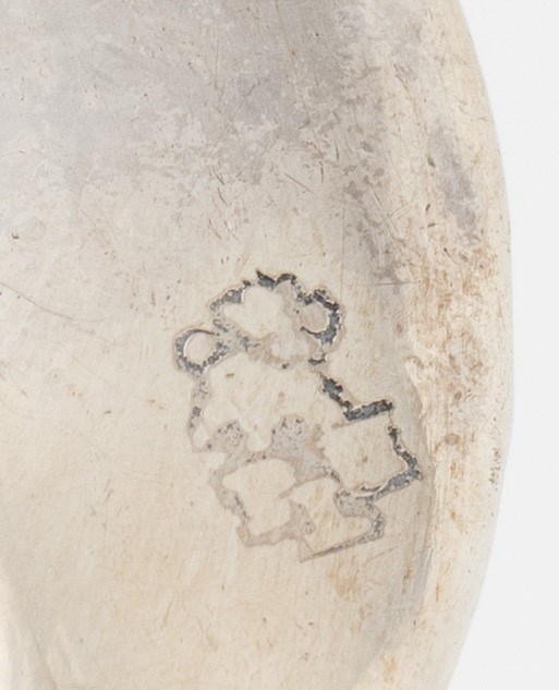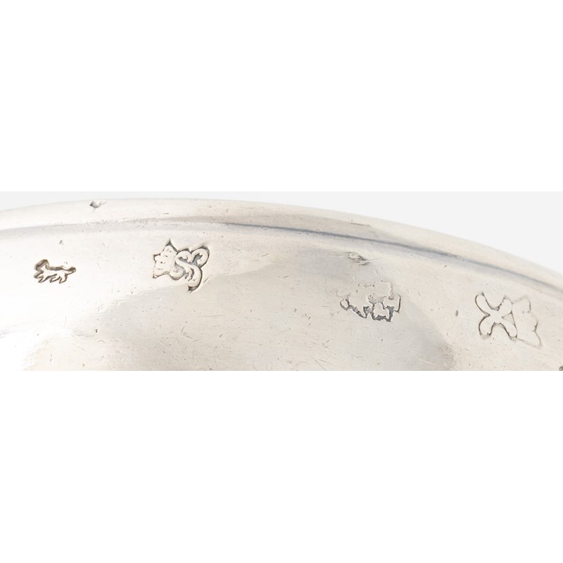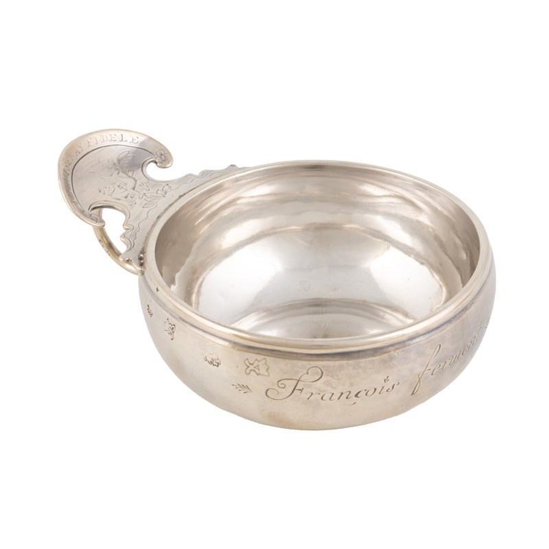 circular form, the shaped scroll thumb-piece engraved with a cherub holding a dog on a lead, also inscribed 'Ie Luiseray Fidele', with a finger ring, the side inscribed 'Francois Ferment', length 11cm, approx. weight 3.9oz.