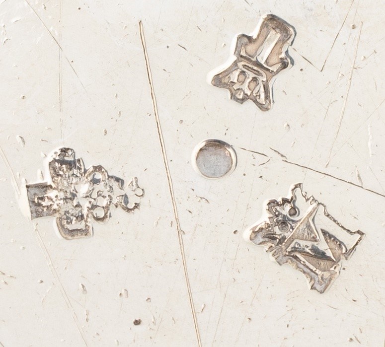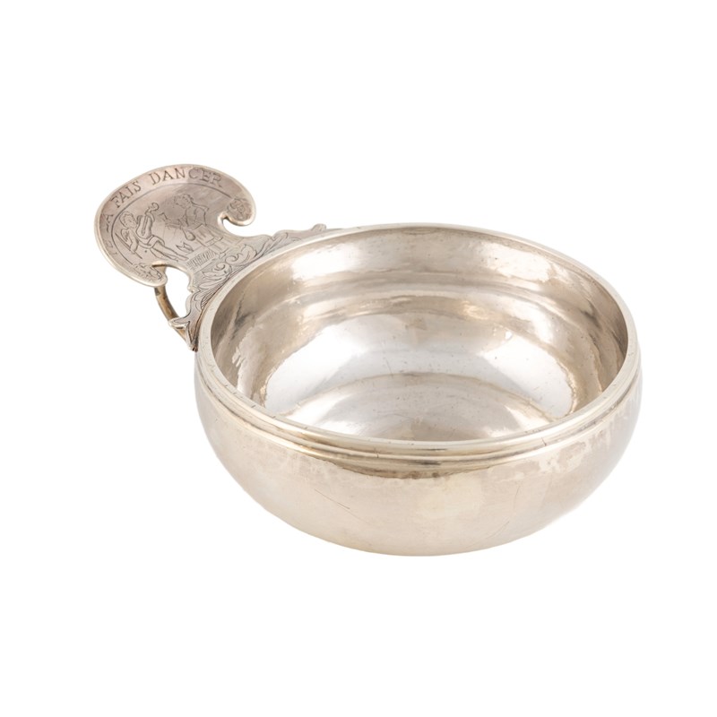 circular form, the shaped scroll thumb-piece engraved with a lady holding a glass of wine and a bottle and with a cherub playing a musical instrument, also inscribed 'Las Fais Danger', with a finger ring, length 11.7cm, approx. weight 3.3oz.
