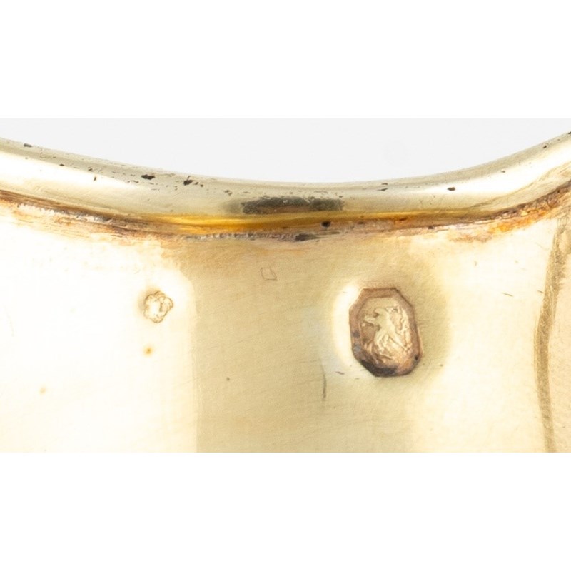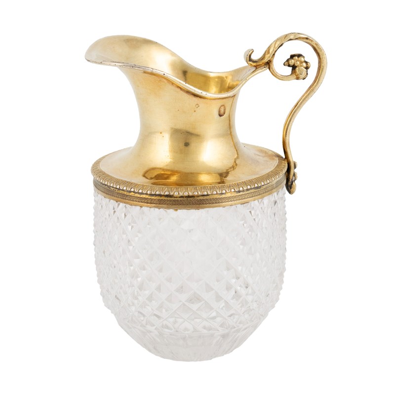 circular form with a cut glass body, leaf border edge with a foliate scroll handle, height 10.3cm.