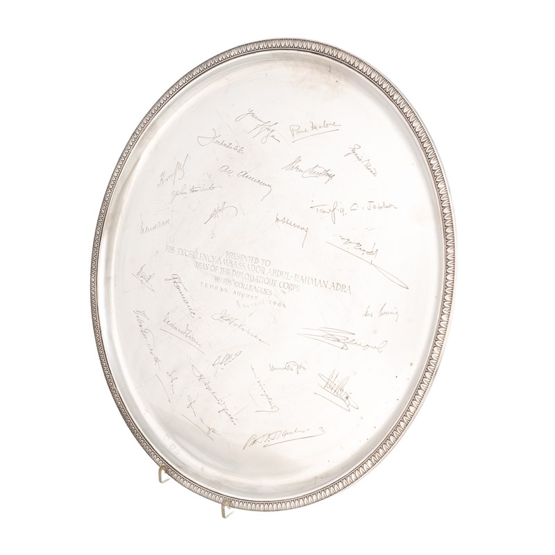 circular form with a leaf border, inscribed 'Presented To His Excellence Ambassador Abdul-Rahman Adra Dean of The Diplomatique Corps By His Colleagues Tehran, August 1964' with surrounding signatures, diameter 45cm, approx. weight 52oz.
