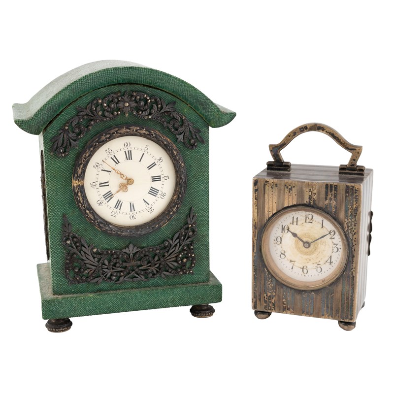rectangular form, with bands of engine-turned decoration, hinged handle, plus a shagreen clock, with pierced foliate mounts, heights 9.5cm and 12cm. (2)