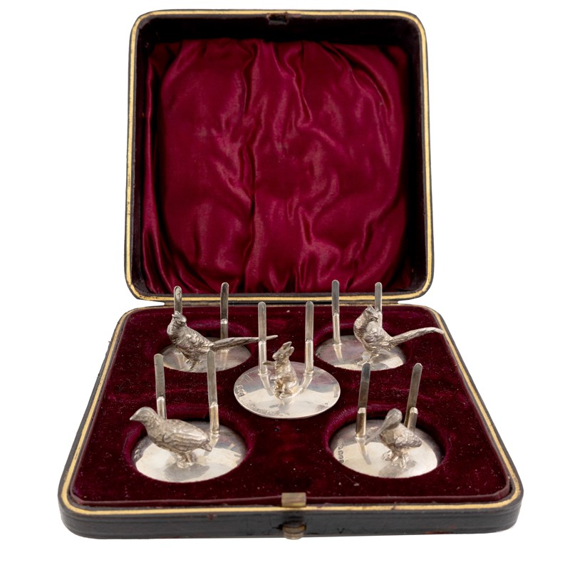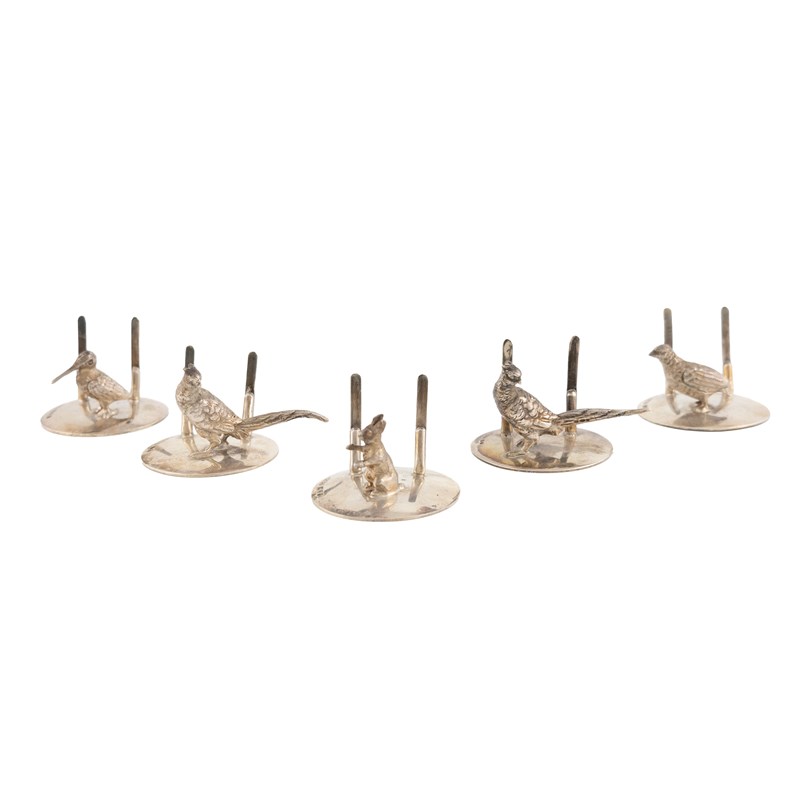 modelled with two pheasants, a woodcock and a grouse on circular bases, diameter 3.7cm plus one similar by Stuart Clifford & Co, London 1911, modelled with a rabbit, with an associated case, total approx. weight 3.5oz. (5)