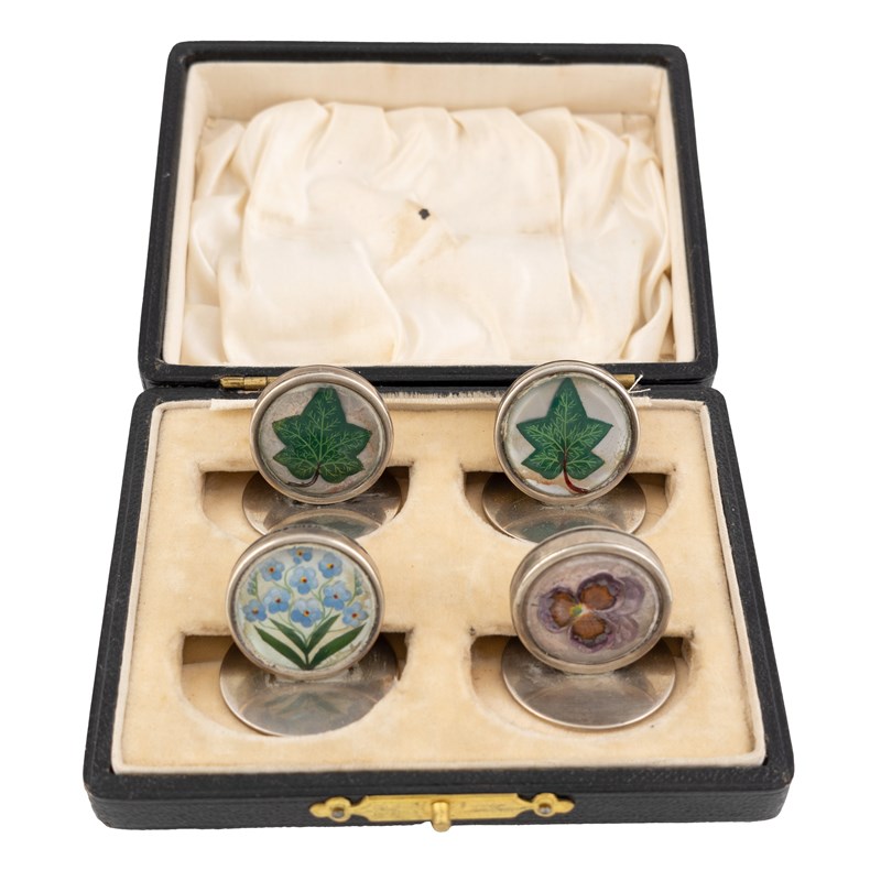 circular form, two with ivy leaves, one with a viola and one with forget-me-nots, on circular bases, in an associated case, length 3cm, total approx. weight 2.8oz. (4)