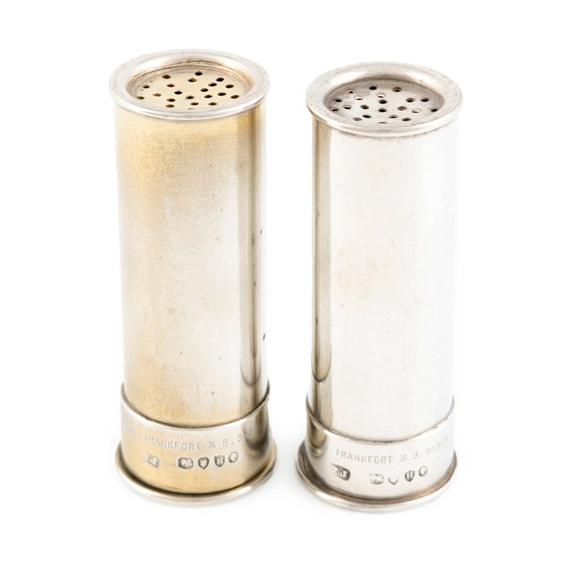 in the form of shotgun cartridges, one with worn gilded decoration, with pierced tops and screw-off bases, height 5.6cm, total approx. weight 1.7oz. (2)