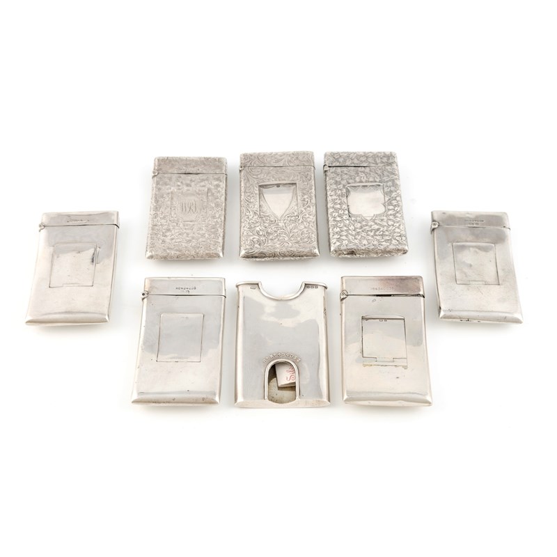 curved rounded rectangular forms, comprising: two by Walker & Hall, Sheffield 1905 and 1908, both with engraved foliate decoration, one by Mappin & Webb, Birmingham 1905, one by Robert Pringle, Birmingham 1904, two by Nathan & Hayes, Birmingham 1904, one with engraved initials, one by Constantine & Floyd Ltd, Birmingham 1903, and a card case by William Devenport, Birmingham 1914, total approx. weight 14.4oz. (8)