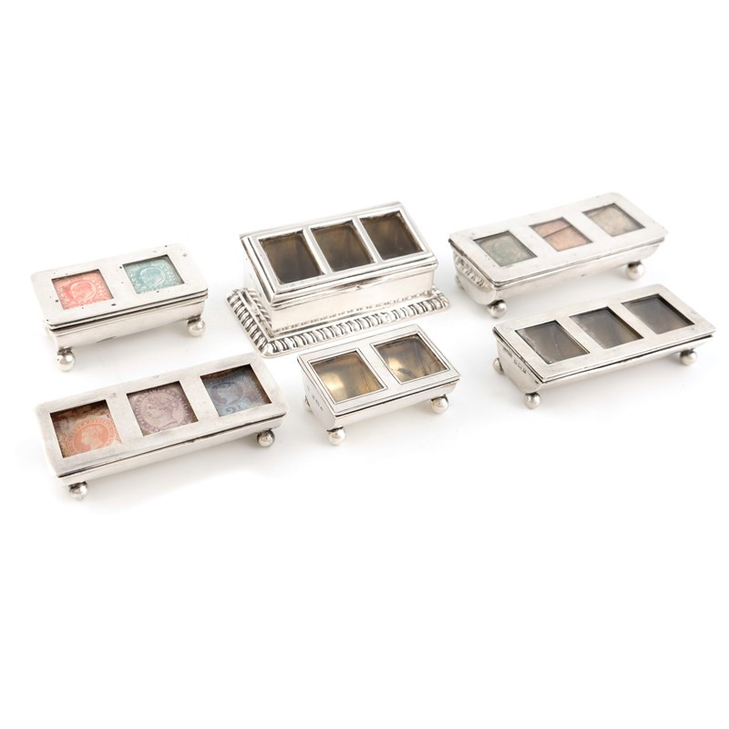 comprising: one by Henry Matthews, Birmingham 1902, rectangular form with a gadrooned border, one by William Walter, Birmingham 1901, one by William Aitken, Birmingham 1902, one by James Deakin & Sons, Birmingham 1902, one by S Blanckensee & Son Ltd, Birmingham 1902, and one by Stokes & Ireland, Birmingham 1914, all of trough form with ball feet, length 9.1cm, total approx. weight 6.6oz. (6)