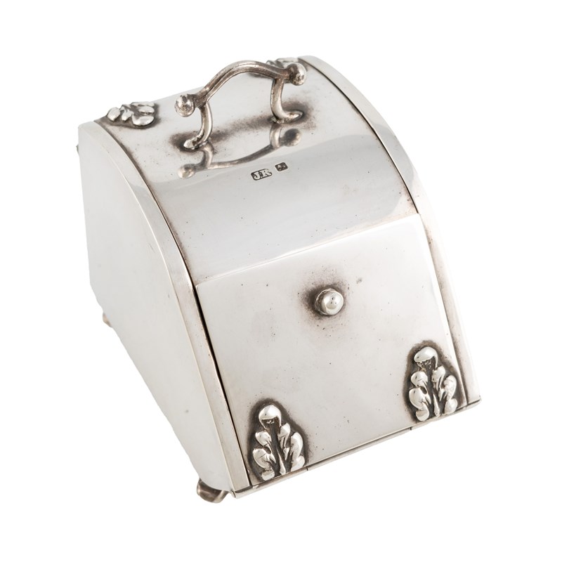 in the form of a coal scuttle, the hinged cover with the handle reveals the inkwell, and the front hinged cover reveals the stamp compartment, on four pad feet, length 7.6cm, approx. weight 4.4oz.