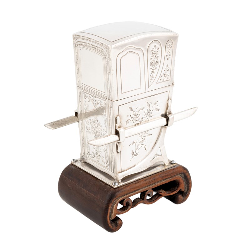 modelled as a Sedan Chair with a hinged top, pull-out carrying poles, engraved with foliate decoration, on a carved wooden plinth, height 12cm.