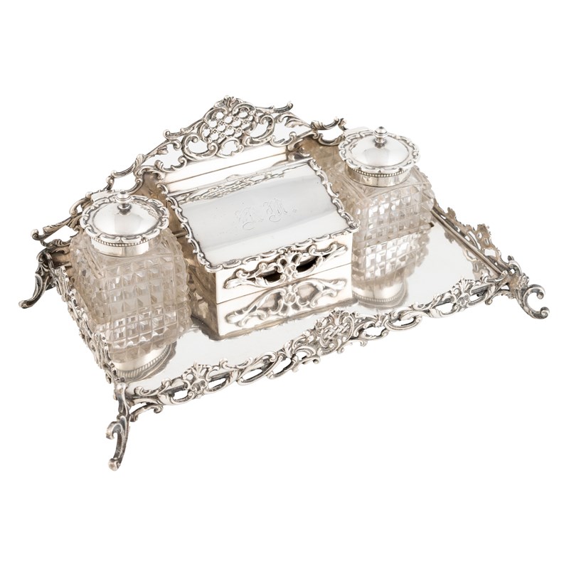 rectangular form with pierced scroll foliate decoration, with two silver-mounted cut glass inkwells and a central engraved hinged stamp compartment, on four scroll feet, length 24cm, approx. weight 16.5oz.