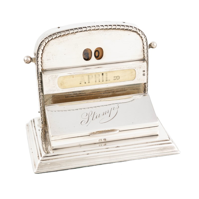 rounded rectangular back with a floral border and sphere switches to the sides, a compartment for celluloid month cards, a stamp box to the front, the cover engraved 'Stamps', on a loaded base, height 9.3cm.