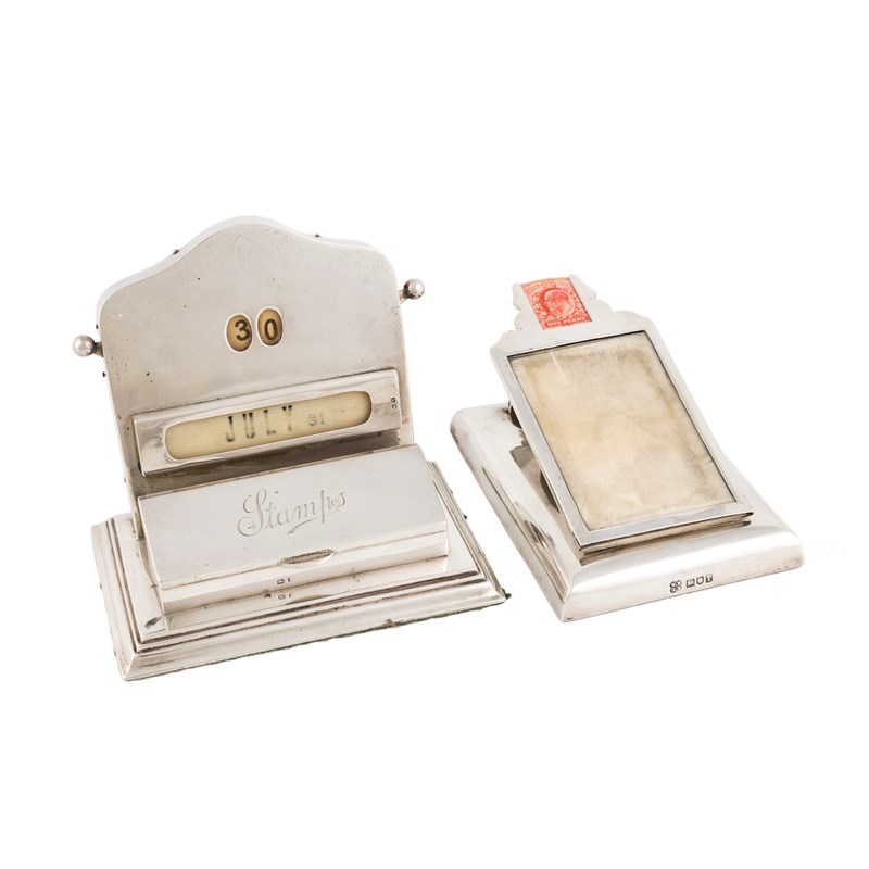 rectangular-shaped back with sphere switches to the sides, a compartment for celluloid month cards, a stamp box to the front, the cover engraved 'Stamps', on a loaded base, plus a silver desk clip and notepad, by W & G Neal, London 1906, length 10cm. (2)