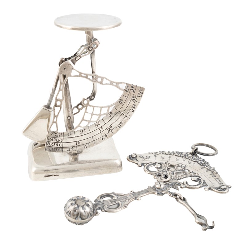 one of a wall pendulum form with scroll foliate decoration and a dove holding a letter, the other with a swing arm and plain circular platform, on a rounded square base, height 12.1cm. (2)