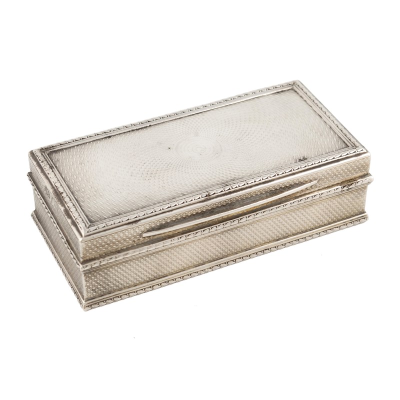 rectangular form with foliate bud borders and engine-turned decoration, length 10.2cm, approx. weight 6.2oz.