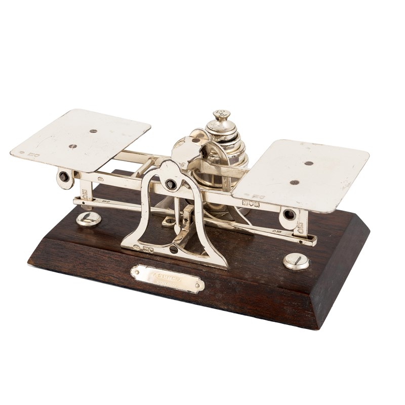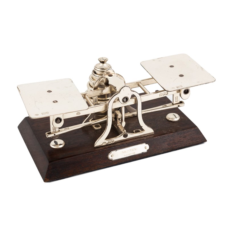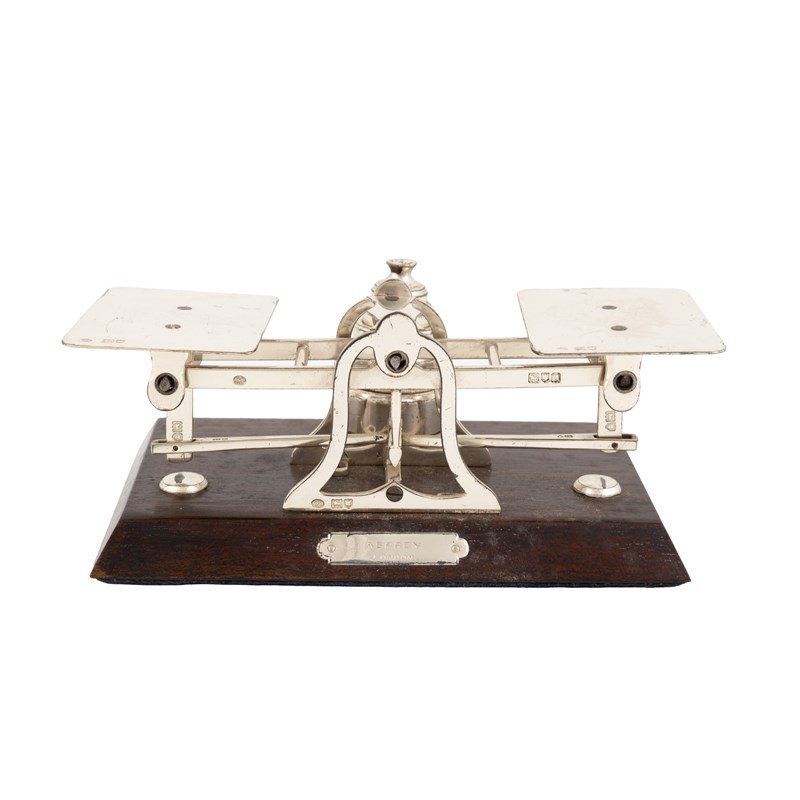 rectangular platforms on a scale frame, on a raised wooden base, with five silver-plated weights, length 15.3cm.