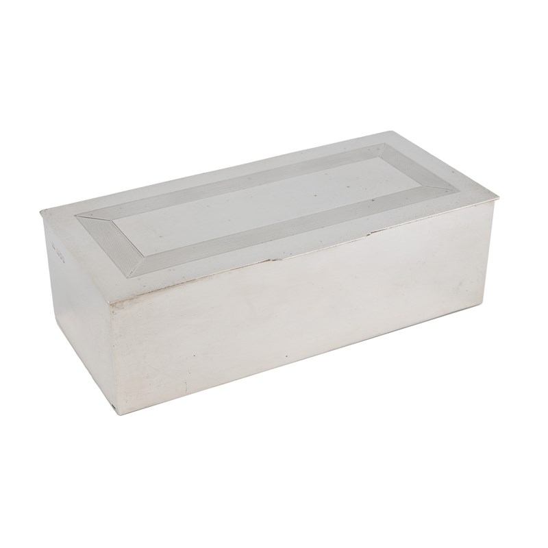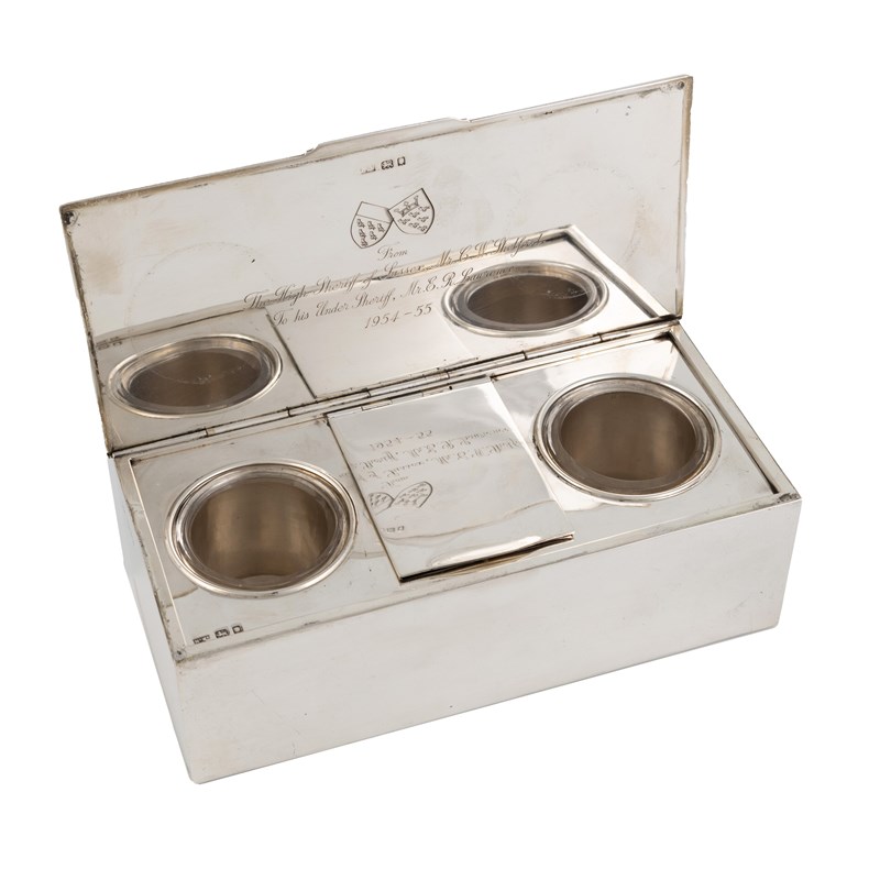 plain rectangular form with engine-turned decoration to the cover, to the interior are two glass inkwells and a covered stamp compartment, to the underside of the cover is engraved two armorial shields, inscribed 'The High Sheriff of Sussex, Mr C.W. Shelford to his Under Sheriff, Mr E.R. Lawrence 1954-55', length 19.5cm.