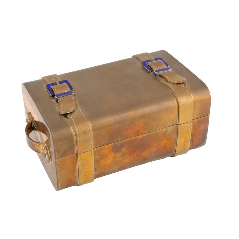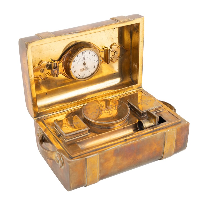 in the form of a trunk with blue buckles, to the underside of the cover a white enamelled dial watch, to the interior a taperstick, an inkwell, stamp and match compartment, the covers engraved 'Lights', 'Ink' and 'Stamps', length 17.8cm.