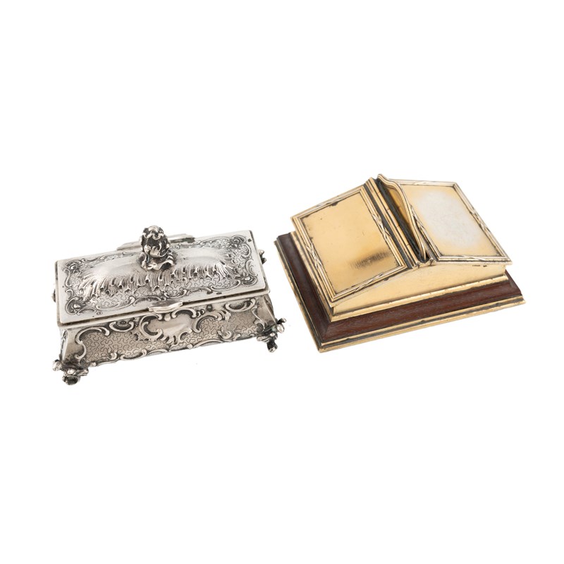 casket form with scroll and shell decoration, stylised flame finial to the cover, on four scroll feet, plus an early-20th century French silver-gilt stamp box by The Keller Brothers, Paris, circa 1920, length 10cm, total approx. weighable 4.6oz. (2)