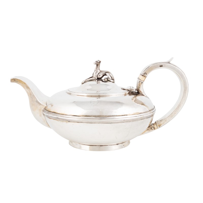 compressed circular form, the scroll handle with ivory insulators, the hinged cover with a recumbent greyhound, length 25.7cm, approx. weight 19.8oz.