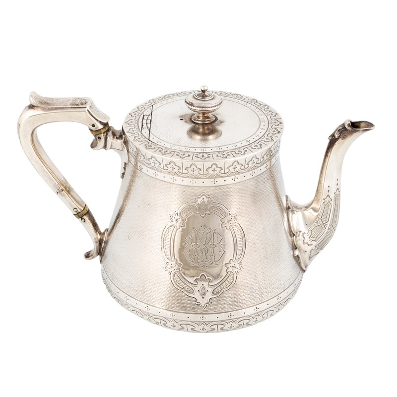 tapering circular form, engine-turned decoration, scroll handle with ivory insulators, initialled, length 22.3cm, approx. weight 24oz.