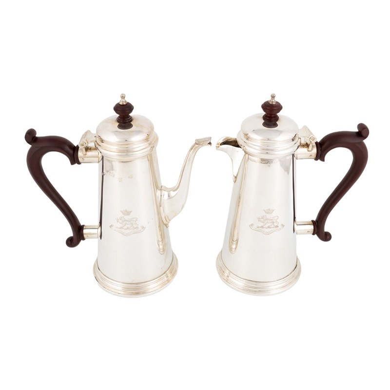 tapering circular form, engraved with a crowned crest and motto, scroll wooden handles, height 22.4cm, total approx. weight 31.6oz. (2)