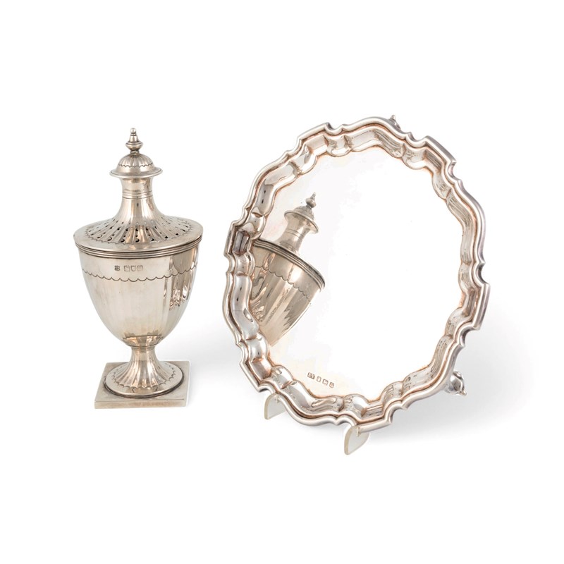 urn form with fluted decoration, pierced pull-off cover with a knop finial, on a square foot, plus a modern silver waiter by Viner's Ltd, Sheffield 1961, diameter 20.7cm, total approx. weight 20.9oz. (2)