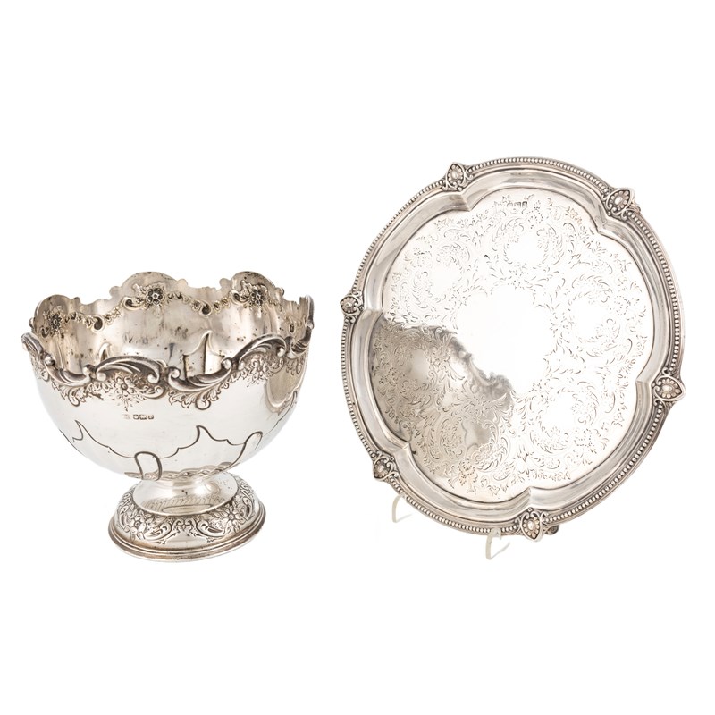 circular form, engraved foliate decoration, beaded border, diameter 22.5cm, plus a small silver rose bowl, by Thomas Levesley, Sheffield 1907, embossed decoration, approx. total weight 22.3oz. (2)