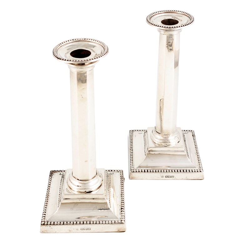 plain octagonal stems, beaded borders, on raised loaded square bases, height 23.4cm. (2)
