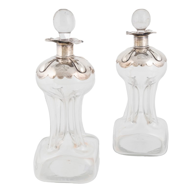 hourglass form, the mounts with lobed decoration, engraved with a crest and with four lips, plain stoppers, heights 30cm and 30.5cm. (2)