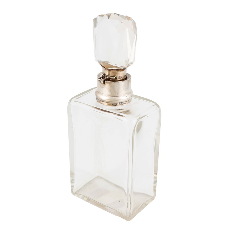 rectangular form with a cut glass stopper, the mount and stopper with lockable loops, height 25.8cm.