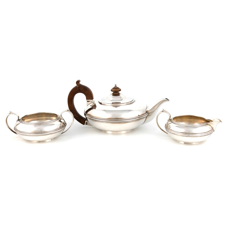 circular form with a reeded girdle, scroll handles, length handle to spout 24cm, total approx. weight 32.7oz. (3)