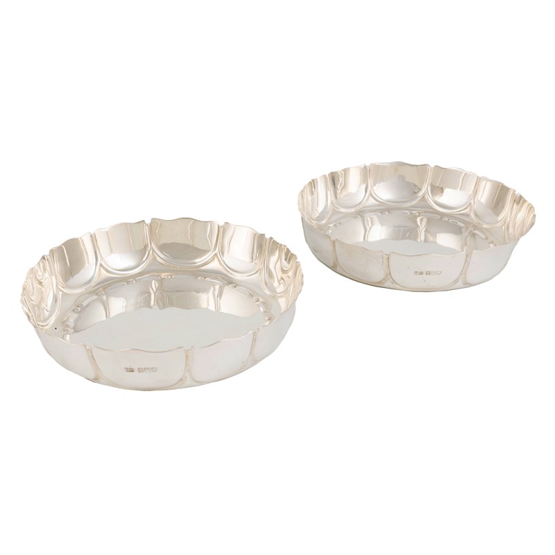 circular fluted form with a wavy-edge border, diameter 20.9cm, total approx. weight 26.6oz. (2)
